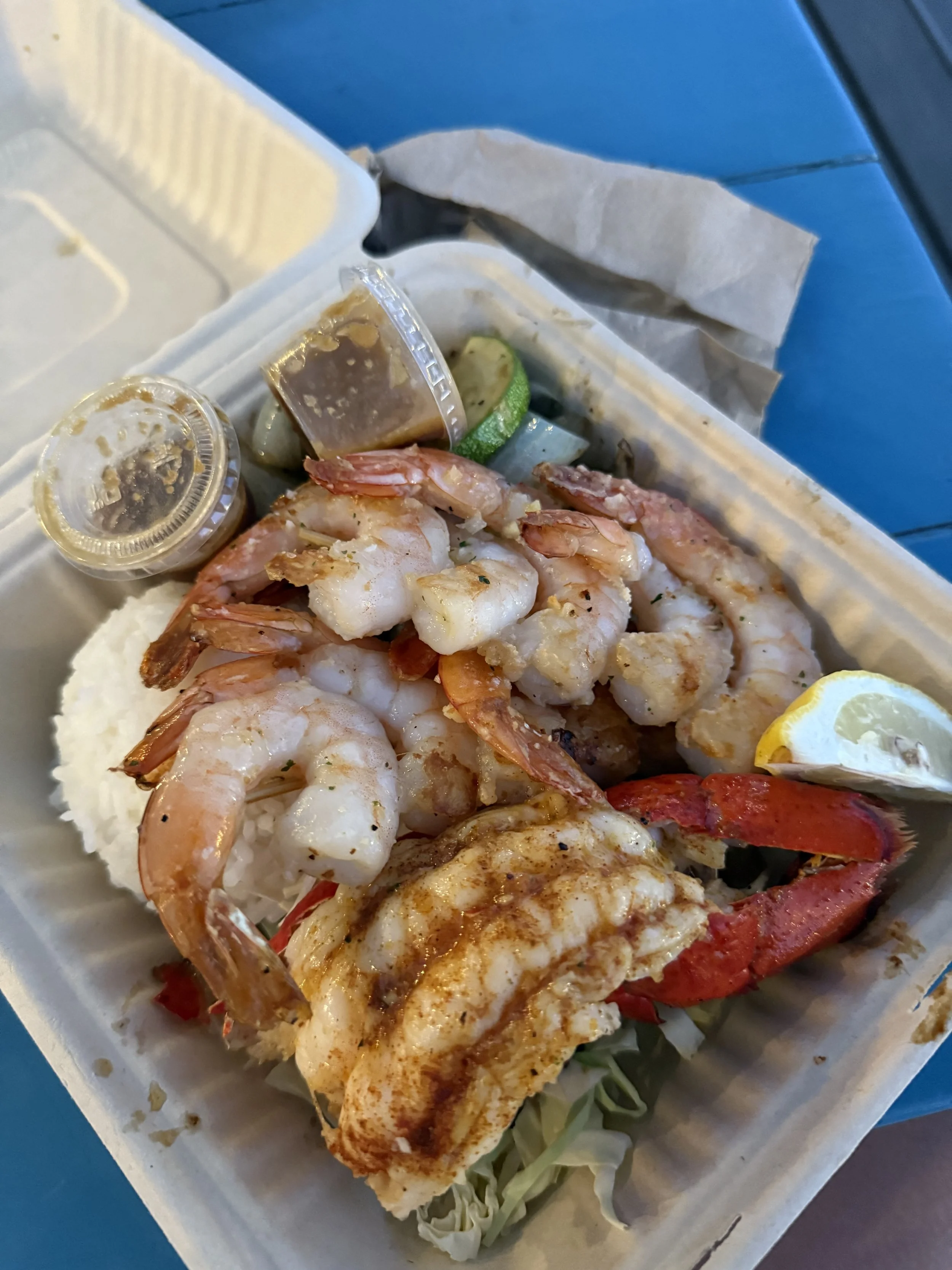 Ono Teppanyaki Seafood Truck: Get the platter — lobster tail, shrimp, rice, and veggies.