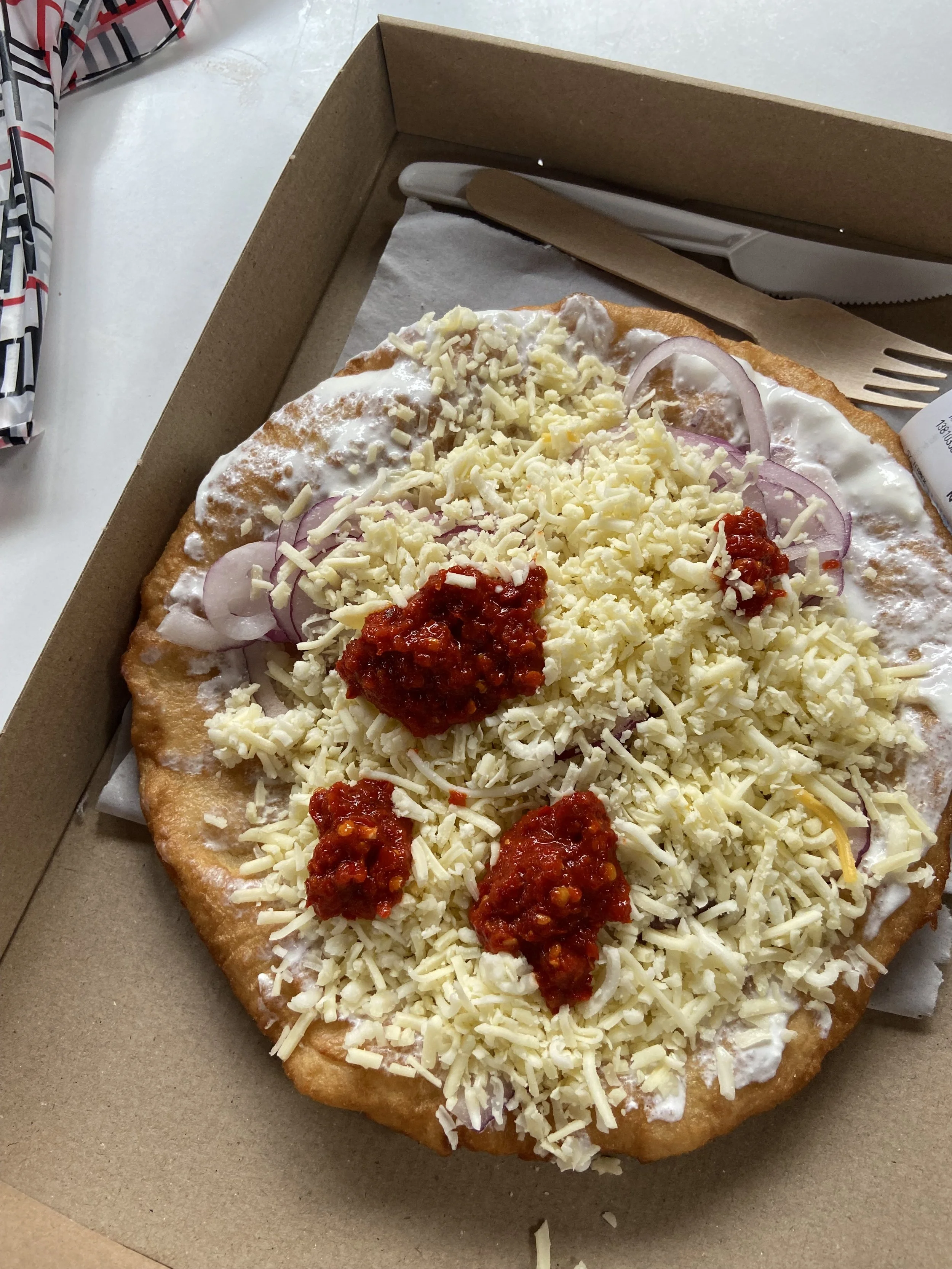 Classic Hungarian street food. Deep‑fried dough that’s crispy on the outside and soft inside, traditionally topped with sour cream and cheese. Rich, indulgent, and perfect after a long day of walking.